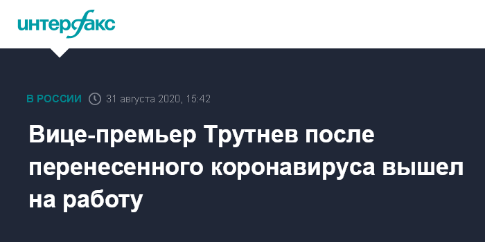 Москва. 31 августа. INTERFAX.RU - Вице-премьер РФ, полномочный представитель президента на Дальнем Востоке Юрий Трутнев, перенесший коронавирусную инфекцию, вышел на работу, сообщил "Интерфаксу" помощник вице-премьера Тимур Чернышев.