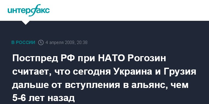 Д.Рогозин также прокомментировал тот факт, что на саммите НАТО не было принято никаких решений относительно вступления в альянс Грузии и Украины. "Тема Украины и Грузии "уехала" на долгие-долгие годы. Сегодня Украина и Грузия дальше от НАТО, чем даже 5-6 лет назад", - уверен он.