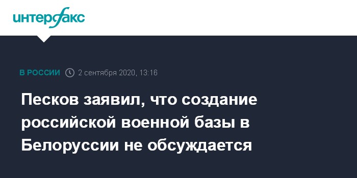 Москва. 2 сентября. INTERFAX.RU - Москва и Минск сейчас не обсуждают возможность создания в Белоруссии российской военной базы, заявил пресс-секретарь президента Владимира Путина Дмитрий Песков.