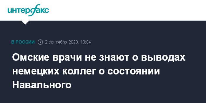 Москва. 2 сентября. INTERFAX.RU - Омские медики, лечившие оппозиционера Алексея Навального, не знакомы с результатами исследований немецкой лаборатории, якобы выявившей у него следы яда из группы "Новичок", сообщил агентству "Интерфакс-Сибирь" заместитель главного врача Больницы скорой медпомощи N1 Анатолий Калиниченко.