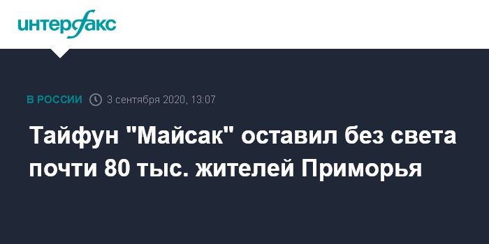 Москва. 3 сентября. INTERFAX.RU - Количество населенных пунктов в Приморском крае, где из-за тайфуна "Майсак" нарушено энергоснабжение, за несколько часов удвоилось.