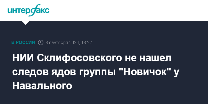 Москва. 3 сентября. INTERFAX.RU - Анализ биологических жидкостей оппозиционера Алексея Навального проводил московский НИИ скорой помощи имени Склифосовского, и следов отравляющих веществ из группы фосфорорганических соединений, к которым относится "Новичок", там не нашли.