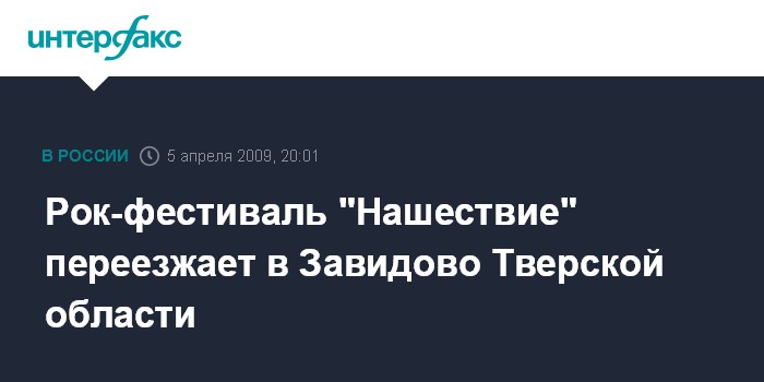 Тверь. 5 апреля. ИНТЕРФАКС-ЦЕНТР - Всероссийский рок-фестиваль "Нашествие" будет проведен этим летом на новой площадке в поселке Большое Завидово Конаковского района Тверской области, сообщили "Интерфаксу" в оргкомитете фестиваля.