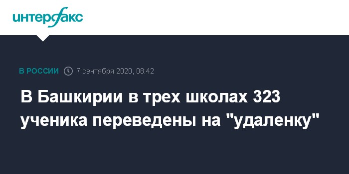 Москва. 7 сентября. INTERFAX.RU - В Башкирии в трех школах старшеклассники заразились коронавирусом, из-за этого в общей сложности больше 300 детей перевели на удаленку, сообщил глава регионального Минздрава Максим Забелин. Он отметил, что речь идет о единичных случаях заражения.