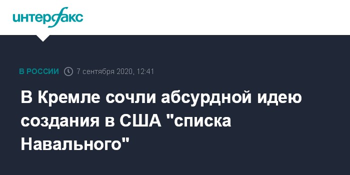 Москва. 7 сентября. INTERFAX.RU - Пресс-секретарь президента РФ Дмитрий Песков назвал абсурдной идею обозревателя New York Times Брета Стивенса о том, чтобы власти США создали "список Навального" по аналогии со "списком Магнитского".