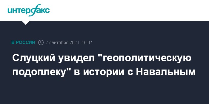 Москва. 7 сентября. INTERFAX.RU - Заявления Берлина по поводу возможности влияния ситуации с оппозиционером Алексеем Навальным на проект "Северный поток 2" подтверждает геополитическую подоплеку всей истории, считает глава комитета Госдумы по международным делам Леонид Слуцкий.