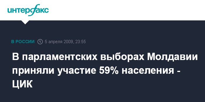 Кишинев. 5 апреля. ИНТЕРФАКС - По предварительным данным, оглашенным Центризбиркомом Молдавии после закрытия избирательных участков, в парламентских выборах участвовали порядка 59 % от общего числа избирателей (2,5 млн человек).