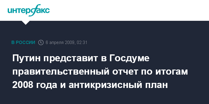 Москва. 6 апреля. ИНТЕФАКС - Госдума в понедельник заслушает отчет председателя правительства РФ Владимира Путина за 2008 год и обсудит проект программы антикризисных мер, представленный кабинетом министров.