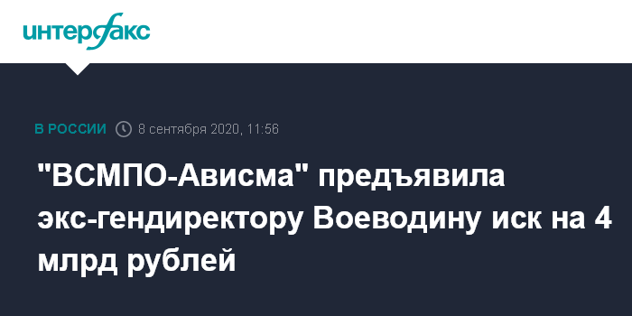Москва. 8 сентября. INTERFAX.RU - "Корпорация "ВСМПО-Ависма" подала к своему бывшему гендиректору Михаилу Воеводину иск о компенсации ущерба на сумму 4,07 млрд рублей, следует из данных картотеки Арбитражного суда Свердловской области. Иск был зарегистрирован 4 сентября.