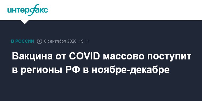 Москва. 8 сентября. INTERFAX.RU - Глава Минздрава России Михаил Мурашко сообщил, что массовые поставки вакцины от коронавируса ожидаются в регионах России уже к ноябрю-декабрю.