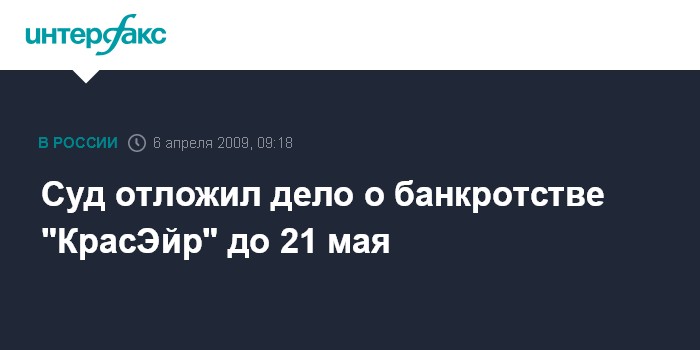 Москва. 6 апреля. INTERFAX.RU - Арбитражный суд Красноярского края в понедельник отложил до 21 мая дело о признании ОАО "Авиакомпания "Красноярские авиалинии" ("КрасЭйр") банкротом по иску ОАО "Ильюшин Финанс Ко" (ИФК), ООО "ТД "Топливное обеспечение аэропортов" (ТоАП), ООО "Финсервис", сообщила агентству "Интерфакс-Сибирь" пресс-секретарь суда Валентина Безруких.