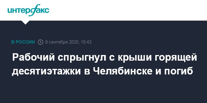 Москва. 9 сентября. INTERFAX.RU - В Челябинске случился пожар на крыше десятиэтажного жилого дома в поселке Мелькомбинат. На крыше было двое рабочих, один получил ожоги 80% тела, второй решил спрыгнуть, спасаясь от огня, и погиб, заявили в областном управлении МЧС.