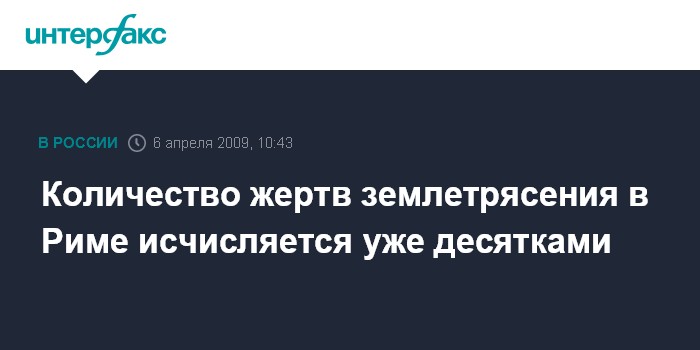 Москва. 6 апреля. INTERFAX.RU – Не менее 20 человек стали жертвами землетрясения в итальянской области Абруццо, которое произошло в понедельник утром, сообщает интернет-сайт итальянской газеты "Репубблика".