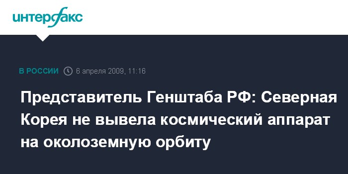 Москва. 6 апреля. INTERFAX.RU – Северная Корея не вывела космический аппарат на околоземную орбиту, заявил в понедельник "Интерфаксу-АВН" высокопоставленный представитель российского Генштаба.