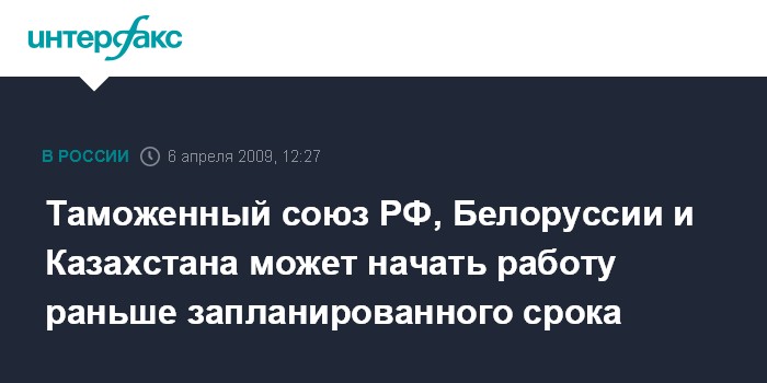 Москва. 6 апреля. INTERFAX.RU - Таможенный союз РФ, Белоруссии и Казахстана может начать работу уже с 2010 года, считает премьер-министр России Владимир Путин. "Практически завершено формирование правовых основ Таможенного союза России, Белоруссии и Казахстана. Я думаю, что запустить работу Таможенного союза мы сможем на год раньше - уже с 2010 года", - сказал Путин, выступая в понедельник с отчетом о деятельности правительства в Госдуме РФ.