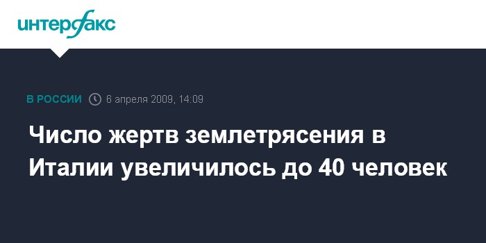 Рим. 6 апреля. INTERFAX.RU - До 40 увеличилось количество людей, погибших в результате землетрясения в итальянской области Абруццо, подтверждают представители итальянских властей в эфире итальянского телеканала "РАИ".