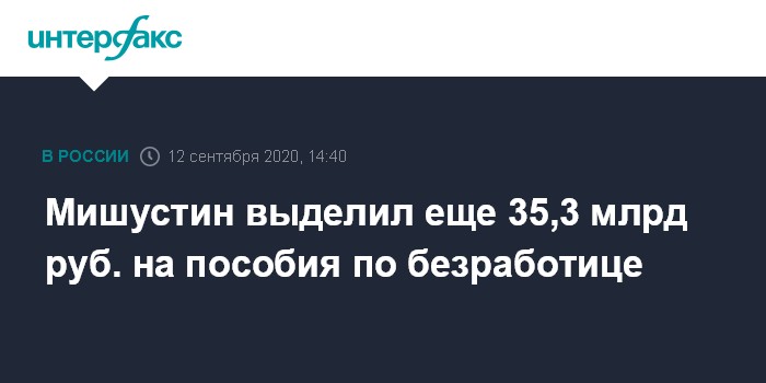Москва. 12 сентября. INTERFAX.RU - На выплату пособий по безработице направят еще 35,3 млрд рублей. Такое распоряжение подписал председатель правительства РФ Михаил Мишустин.
