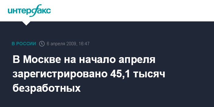 Москва. 6 апреля. INTERFAX.RU - По данным на 3 апреля, в Москве зарегистрировано 45,1 тыс. безработных, сообщили "Интерфаксу" в понедельник в пресс-службе департамента труда и занятости населения города. "Уровень официальной безработицы в столице достиг 0,68%", - сказал собеседник агентства.