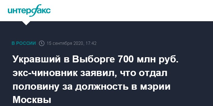 Укравший в Выборге 700 млн руб. экс-чиновник заявил, что отдал половину за должность в мэрии Москвы