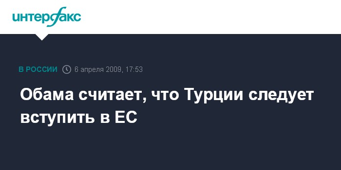Москва. 6 апреля. INTERFAX.RU - Президент США Барак Обама заявил в понедельник, что поддерживает идею вступления Турции в Европейский Союз. "Этот шаг расширит и укрепит европейские основы", - сказал он во время выступления в парламенте Турции.