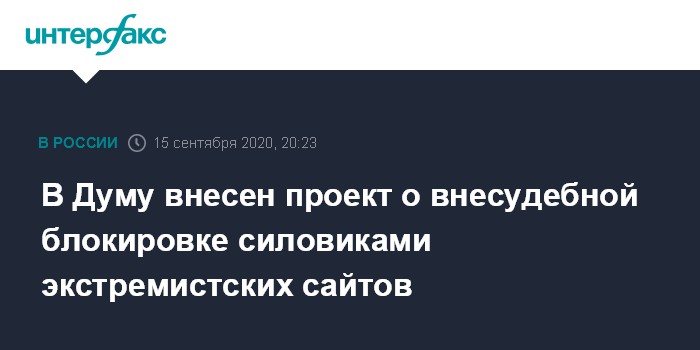 Москва. 15 сентября. INTERFAX.RU - В Госдуму внесен законопроект, в соответствии с которым силовые структуры смогут инициировать блокировку любого интернет-ресурса как экстремистского на основании заключения эксперта.