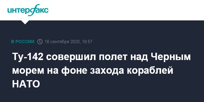Москва. 16 сентября. INTERFAX.RU - Дальний противолодочный самолет ВМФ России Ту-142 совершил пятичасовой полет над акваторией Черного моря, куда ранее вошли корабли НАТО. Об сообщили в департаменте информации и массовых коммуникаций Минобороны РФ.
