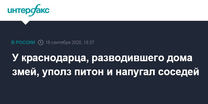 Москва. 16 сентября. INTERFAX.RU - Нелегальный серпентарий обнаружен в одной из квартир многоэтажного дома в Краснодаре после того, как из него уполз питон и напугал соседей. Об этом сообщила пресс-служба прокуратуры Краснодарского края в среду.