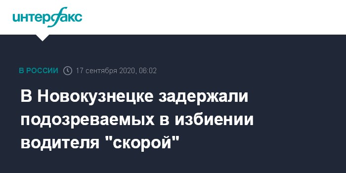 Москва. 17 сентября. INTERFAX.RU - Новокузнецкие полицейские задержали подозреваемых в избиении в ночь на четверг водителя скорой помощи, возбуждено уголовное дело, сообщили "Интерфаксу" в пресс-службе Главного управления МВД по Кузбассу.