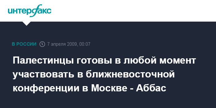 Москва. 7 апреля. ИНТЕРФАКС - Палестина приветствует скорейшее проведение в Москве конференции по урегулированию ближневосточного конфликта, заявил лидер Палестинской автономии Махмуд Аббас в интервью газете "Время новостей".