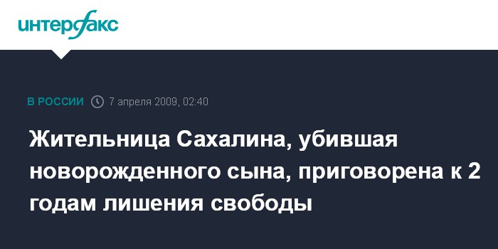 Южно-Сахалинск. 7 апреля. ИНТЕРФАКС - ДАЛЬНИЙ ВОСТОК - Жительница Сахалина приговорена к 2 годам лишения свободы с отбыванием наказания в колонии-поселении за убийство своего новорожденного сына.