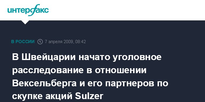 Москва. 7 апреля. INTERFAX.RU - Федеральный департамент финансов Швейцарии начал административную процедуру в рамках уголовного права в отношении владельца группы "Ренова" Виктора Вексельберга и двух австрийских предпринимателей Ронни Печика и Георга Штумпфа. Они подозреваются в нарушении правил раскрытия информации при скупке акций машиностроительного концерна Sulzer, говорится в сообщении ведомства.