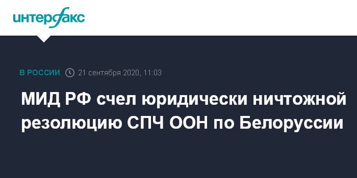 Москва. 21 сентября. INTERFAX.RU - В Москве считают дебаты в СПЧ ООН по Белоруссии попыткой вмешательства во внутренние дела страны, а принятую по их итогам резолюцию юридически ничтожной, заявили в МИД РФ.