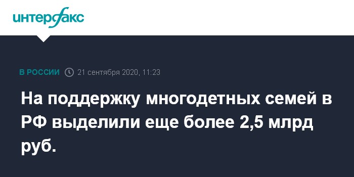 Москва. 21 сентября. INTERFAX.RU - 36 регионов России получат свыше 2,5 млрд рублей на поддержку многодетных семей, соответствующее распоряжение подписано правительством РФ.