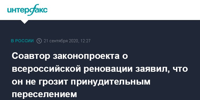 Москва. 21 сентября. INTERFAX.RU - Законопроект о реновации жилого фонда в регионах России не предусматривает принудительного изъятия жилья и переселения граждан, сообщил "Интерфаксу" член Совета Федерации Олег Мельниченко, участвовавший в разработке инициативы.