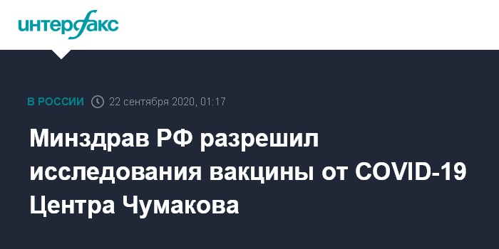 Москва. 22 сентября. INTERFAX.RU - Минздрав РФ разрешил провести клинические исследования вакцины от коронавируса Центру Чумакова, сообщает пресс-служба министерства.
