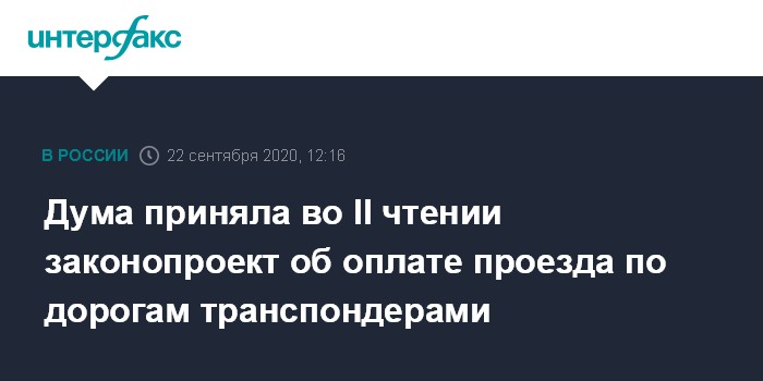 Москва. 22 сентября. INTERFAX.RU - Госдума приняла во втором чтении законопроект о платных автодорогах вместе с новыми поправками, которые впервые в России регламентируют технологию безбарьерного взимания платы за проезд "свободный поток" (free flow).