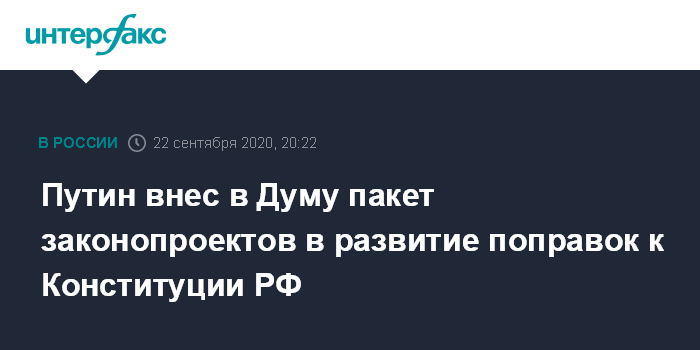 Москва. 22 сентября. INTERFAX.RU - Президент России Владимир Путин внес в Государственную Думу пакет законопроектов в развитие поправок в Конституцию, сообщает комитет по государственному строительству и законодательству.