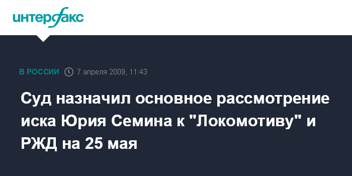 Москва. 7 апреля. INTERFAX.RU - Арбитражный суд Москвы назначил на 25 мая основное слушание по иску Юрия Семина к ЗАО ФК "Локомотив" и его основному акционеру - ОАО "Российские железные дороги", сообщили "Интерфаксу" в суде.