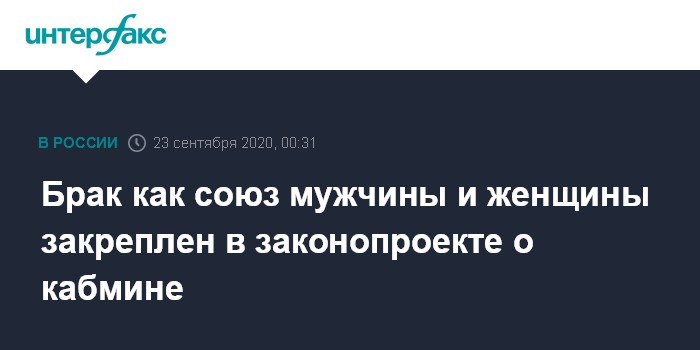 Москва. 23 сентября. INTERFAX.RU - Обеспечивать защиту брака как союза мужчины и женщины будет в том числе и кабмин, это предусмотрено новым законом о правительстве России, внесенном в Госдуму президентом РФ во вторник.