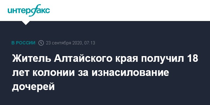 Москва. 23 сентября. INTERFAX.RU - Суд в Алтайском крае вынес приговор жителю одного из сел Каменского района края, признав его виновным в сексуальном насилии над своими тремя дочерями, сообщает пресс-центр следственного управления СКР по региону.