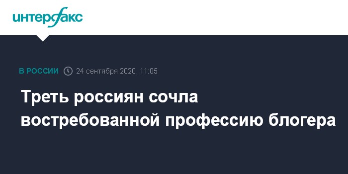 Москва. 24 сентября. INTERFAX.RU - Каждый третий россиянин (35%) уверен, что деятельность блогера переходит из статуса модного времяпрепровождения в профессию будущего с перспективой высокой востребованности, свидетельствуют данные опроса ВЦИОМ, поступившие в четверг в "Интерфакс".