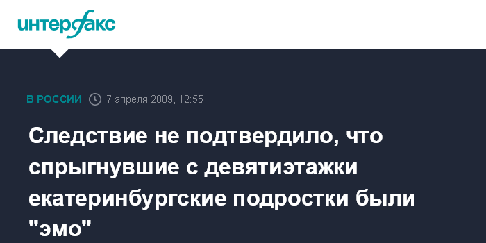 Москва. 7 апреля. INTERFAX.RU - Следствие не видит оснований для возбуждения уголовного дела по факту попытки самоубийства семнадцатилетних юноши и девушки, спрыгнувших в минувшие выходные с крыши девятиэтажного здания в Екатеринбурге.