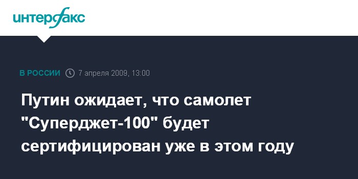 Москва. 7 апреля. INTERFAX.RU - Сертификация самолета "Суперджет-100" ожидается в ближайшее время, в 2009 году, заявил премьер-министр РФ Владимир Путин.