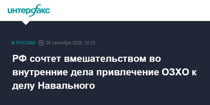 Москва. 25 сентября. INTERFAX.RU - Россия расценит как вмешательство в свои внутренние дела возможное привлечение к "делу Навального" группы ОЗХО по расследованию и идентификации (ГРИ), заявил в интервью "Интерфаксу" постпред РФ при организации Александр Шульгин.