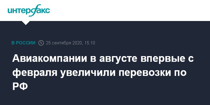 Москва. 25 сентября. INTERFAX.RU - Авиакомпании РФ в августе впервые с февраля увеличили перевозки пассажиров внутри страны: рост составил 5,7% к августу прошлого года, до 8,57 млн человек, следует из данных Росавиации.