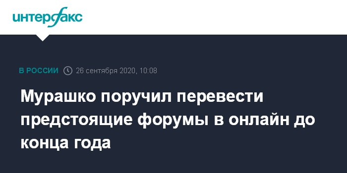 "Министерство здравоохранения РФ сообщает, что в связи с напряженной эпидемической ситуацией по коронавирусной инфекции ... необходимо организовать работу по участию в ранее запланированных, а также планируемых до конца 2020 года конгрессах, форумах и семинарах в онлайн-формате", - говорится в документе, оказавшемся в распоряжении "Интерфакса".