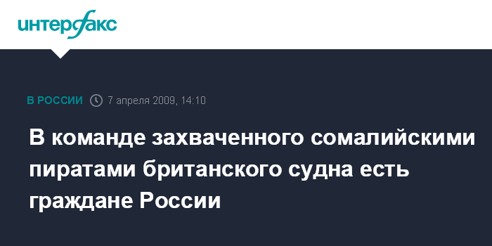 Москва. 7 апреля. INTERFAX.RU - На борту захваченного сомалийскими пиратами британского судна "Маласпина кастл" находятся граждане России, подтверждает во вторник британская газета "Дейли телеграф".