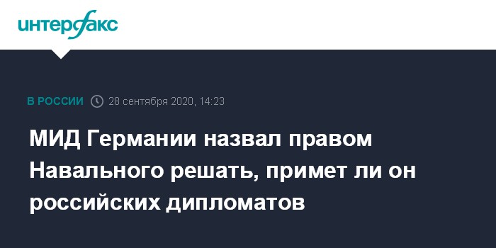 Москва. 28 сентября. INTERFAX.RU - Представитель МИД Германии Мария Адебар опровергла предположения, что ведомство ограничило консульский доступ сотрудников посольства России к Алексею Навальному. По ее словам, решение о встречах с российскими дипломатами политик принимает сам.