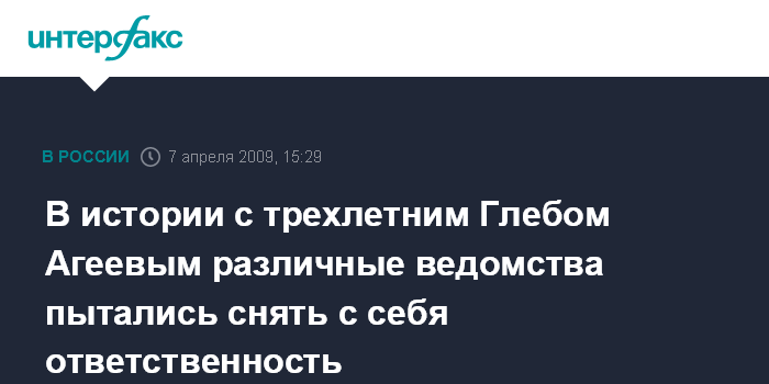 Москва. 7 апреля. INTERFAX.RU - Уполномоченный по правам ребенка в Москве Алексей Головань считает, что в истории с усыновленным семьей Агеевых трехлетним Глебом задействованные в ней ведомства пытались снять с себя ответственность. "Эта ситуация показала, как могут вести себя ведомства, пытаясь снять с себя всякую ответственность, сделать вид, что ничего не произошло. Не было должного взаимодействия между структурами, задействованными в ситуации", - сказал он в интервью "Интерфаксу".