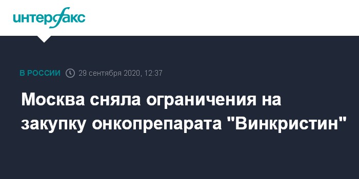 Москва. 29 сентября. INTERFAX.RU - Правительство отменило ограничения на госзакупки противолейкозного препарата "Винкристин", сообщила пресс-служба кабинета министров. В январе на исчезновение этого и других препаратов с рынка жаловались в (НМИЦ) детской гематологии, онкологии и иммунологии им. Дмитрия Рогачева.